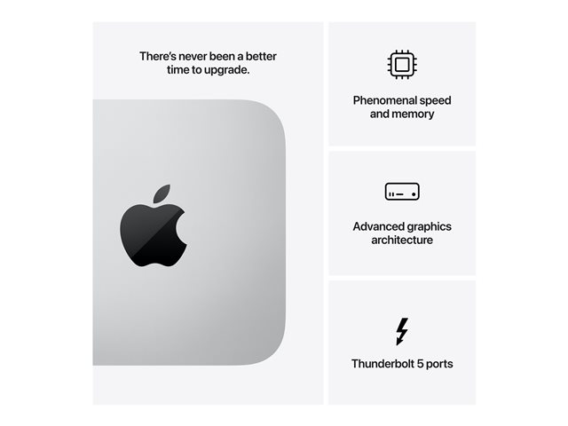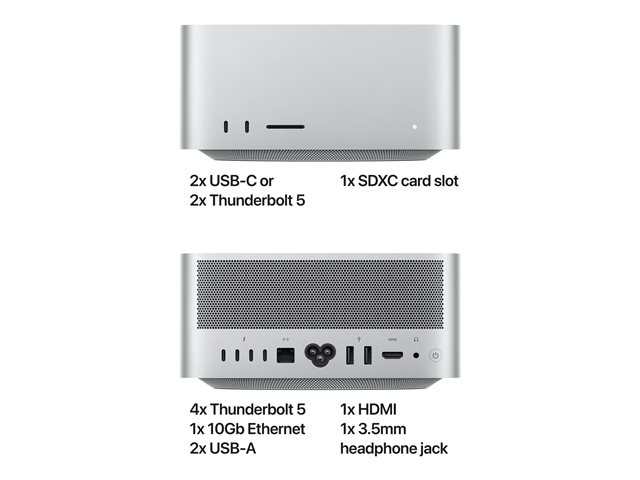 | Grensesnitt | 4 x Thunderbolt 5/USB4/DisplayPort 2.1 - Type C (4 bak) 2 x USB 3.0 - Type A (2 bak) 1 x HDMI 1 x LAN (10Gigabit Ethernet) - RJ-45 (1 bak) 1 x hodetelefon - minijakk (1 bak) 2 x Thunderbolt 5 - Type C (2 foran) |