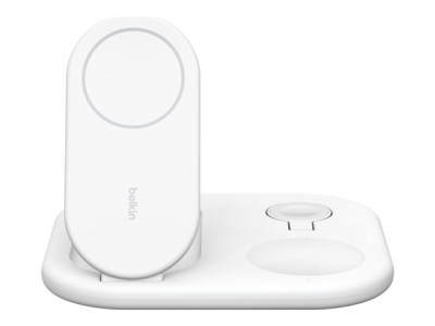 Belkin BoostCharge 3-in-1 - Trådløst ladestativ - magnetisk, sammenleggbar, med Qi2 + AC-strømadapter - 15 watt - Fast Charge - hvit WIZ029VFWH