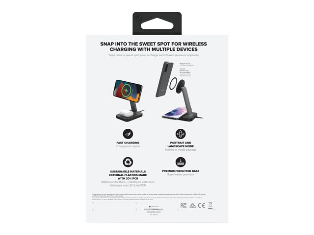 Magnetic Latch+ ladestativ og Pad+ lar deg lade telefonen og hodetelefonene på kort tid. Stativet holder enheten i stående eller liggende modus og leverer opptil 7,5-15 W trådløs kraft. Så du kan se TV-programmer, videochatte eller skanne meldinger mens telefonen er magnetisk festet til snap+-stativet og nettbrettet. Det er til og med et dedikert sted å lade AirPods.