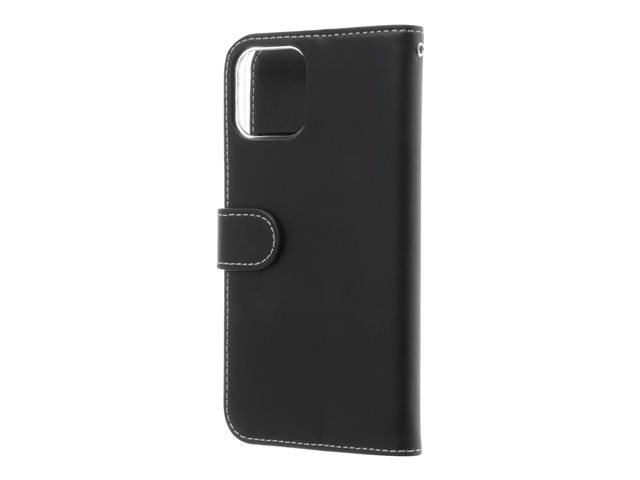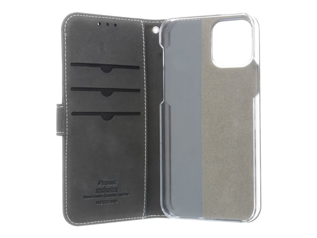 Insmat Exclusive Flip Case - Lommebok for mobiltelefon - papir, kartong, lær, polykarbonat, bomull, aluminiumsfolie - svart - for Apple iPhone 12, 12 Pro 650-2879