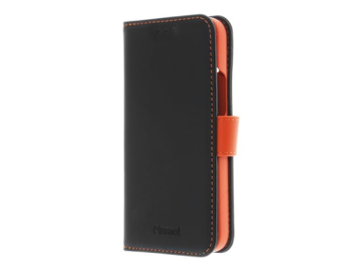 Insmat Exclusive Flip Case - Lommebok for mobiltelefon - ekte skinn, polykarbonat, bomullssting, kartong+papir - svart og oransje - for Apple iPhone 14 Pro 650-3114