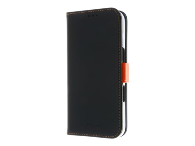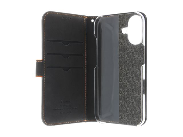 Insmat Exclusive - Lommebok for mobiltelefon - ekte skinn, kartong+papir+aluminiumsfolie, polykarbonat (PC), bomullssting - svart / oransje - for Apple iPhone 16 650-3286