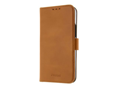 Insmat Premium FlipCase - Lommebok for mobiltelefon - ekte skinn, polykarbonat, bomullssting, kartong+papir - brun - for Apple iPhone 14