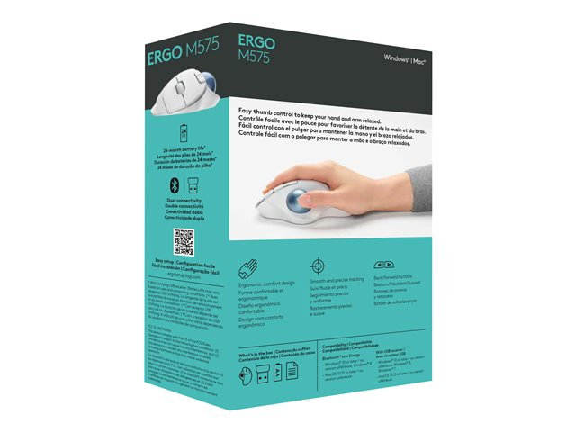 Minimer bevegelsene og maksimer komforten med ERGO M575 - en trådløs styrekule med ergonomisk utforming. Når du ikke trenger å bevege armen for å flytte markøren, kan du slappe av i hånden og armen. Den smidige og responsive tommelkontrollen kan brukes overalt - og siden du ikke trenger å flytte den, passer ERGO M575 perfekt når det er lite plass på skrivebordet.
