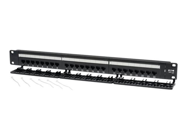 Eaton Tripp Lite Series 24-Port Cat6 Cat5 Patch Panel er en viktig komponent for enhver nettverksinfrastruktur. Dette patchpanelet er designet for montering i et 1U rack og gir et sentralisert sted for terminering av nettverkskabler. Panelet støtter CAT 6-kabling, noe som sikrer høyhastighets dataoverføring og pålitelig tilkobling for alle tilkoblede enheter. Med 24 RJ-45-porter har det plass til et stort antall tilkoblinger, noe som gjør det ideelt for bedrifter og datasentre som ønsker å utvide nettverket sitt. 110-type terminering og T568B-koblingsskjema sørger for et sikkert og standardisert oppsett, samtidig som samsvar med UL-standarder garanterer sikkerhet og ytelse. Den slitesterke metallkonstruksjonen og kompatibiliteten med 19" rack gjør den til et allsidig og pålitelig valg for organisering og optimalisering av nettverkstilkoblinger.