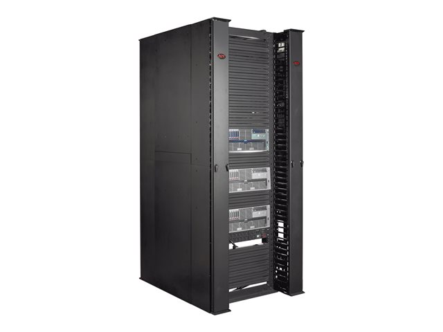Slide-on covers conceal cables within vertical cable managers at the end of a post row of open frame racks for a clean, professional look.