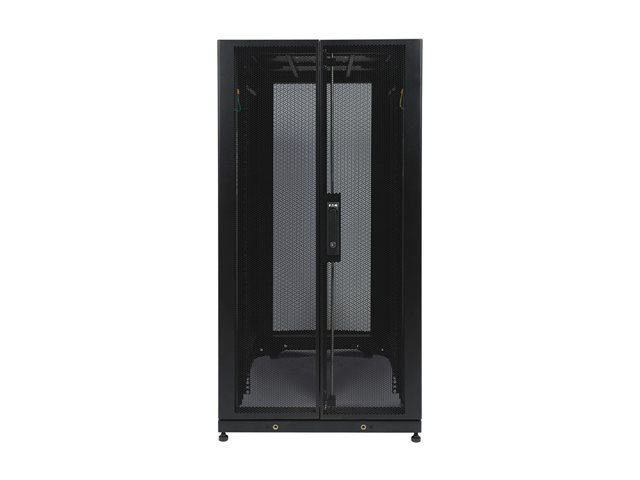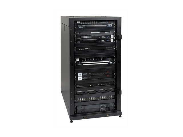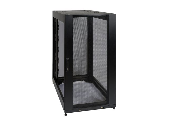 Tripp Lite's SR25UB premium SmartRack Enclosure Cabinet is packed with features designed to simplify rack equipment installations and rack equipment maintenance: top and bottom cable routing ports, perforated door and side panels to promote efficient airflow, adjustable vertical mounting rails and more. And as part of the SmartRack family, the SR25UB is compatible with Tripp Lite's extensive range of rackmount accessories, enabling you to customize your solution to meet any requirement. The SR25UB has 25U of capacity and is compatible with all standard 19-inch rack equipment. The front and rear pairs of vertical rails feature square mounting holes and are numbered by rack space for easy reference. The rails are adjustable in quarter-inch increments to accommodate equipment depths from 4 to 37 inches. Adjustment is quick and convenient: simply unscrew the rails, slide them to the desired depth and restore the screws. The rails feature square mounting holes and are capable of supporting up to 3000 lbs. (1360.8 kgs) of equipment with included installation hardware (2250 lbs. (1020.6 kgs) rolling capacity). With a locking, reversible front door and locking, removable side panels, SR25UB provides safe, secure installation for all equipment. This prevents unauthorized access to installed equipment while making it easy for authorized personnel to perform inspections, maintenance and equipment replacement. The enclosure meets all requirements toward PCI DSS compliance. The top and bottom panels of the SR25UB are furnished with vents designed to help remove warm air from the enclosure and draw in cool air by convection. They also support installation of standard user-supplied case fans. The top and bottom panels are also provided with ports for cable routing. To simplify deployment, the SR25UB comes with casters that enable it to be maneuvered into to desired location, and then secured in place by adjusting the unit's levelers.