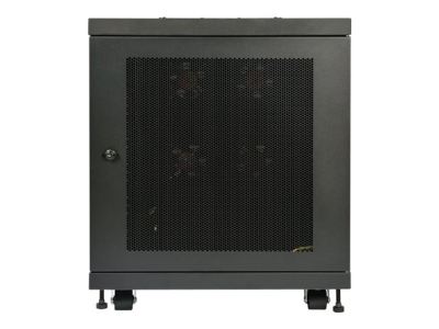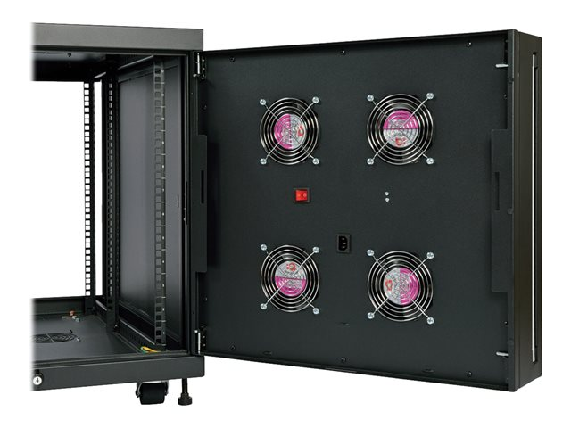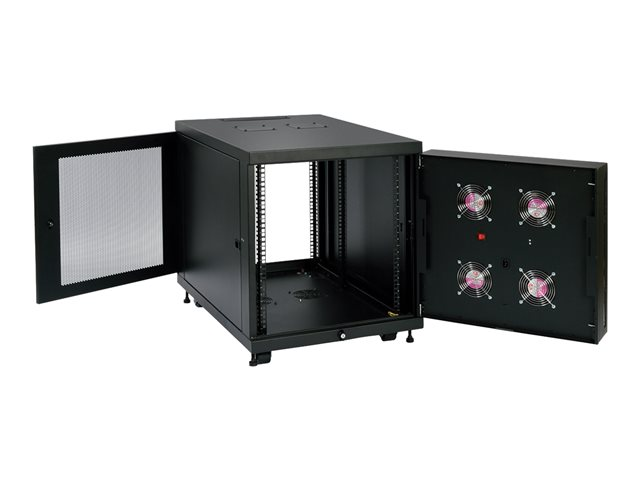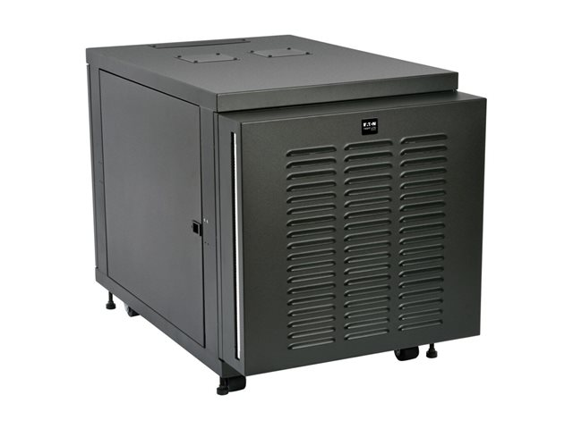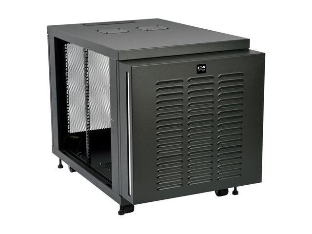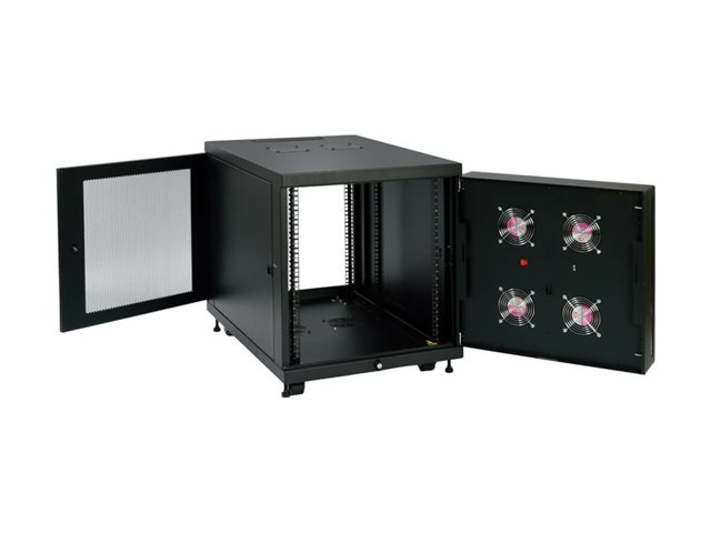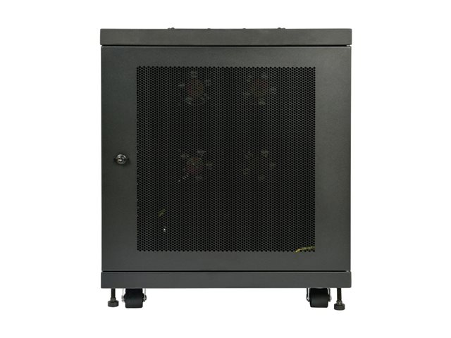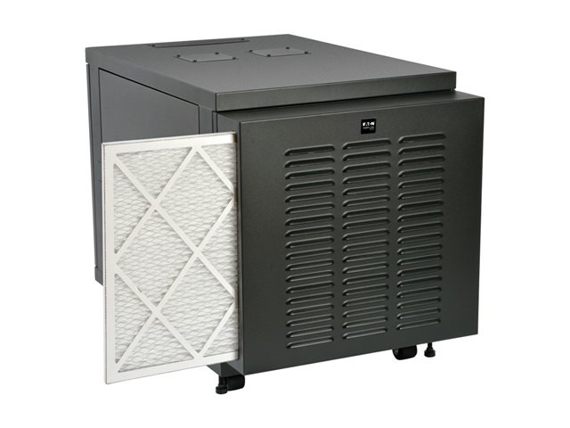 The SRX12UBFFD has an IP54 (NEMA 12) protection rating, protecting sensitive equipment against dirt, dust, lint, oil, drips and splashes. Its pre-installed air filter and louvered vents on the front door prevent dripping water, oil and airborne contaminants from getting inside. You can replace the air filter with standard, off-the-shelf furnace filters. Four high-performance intake fans built into the front door pull filtered air through the cabinet to keep your equipment cool.