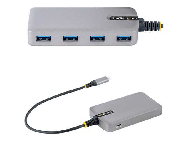 This USB hub adds four USB-A 3.2 Gen 1 (5 Gbps) ports to a USB-C enabled desktop or laptop computer. The USB hub connects to a USB-C port on a computer, using the built-in 1 ft. (30 cm) host cable. The USB hub is backward compatible with USB 2.0 (480 Mbps) devices, ensuring support for a wide range of modern and legacy USB peripherals (e.g., thumb drives, external HDDs/SSDs, HD cameras, mice, keyboards, webcams, and audio headsets). The USB hub is compact in size, facilitating portability when traveling.
