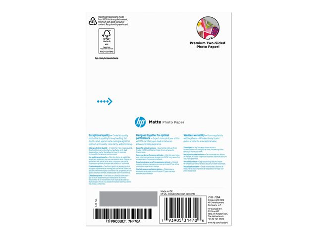HP - Matt - 8,8 mille - 100 x 150 mm - 180 g/m² - 25 ark fotopapir - for Deskjet Ink Advantage 1275; Officejet 38XX, 46XX, 52XX, 57XX, 68XX, 69XX, 80XX, 8702, 9012 7HF70A