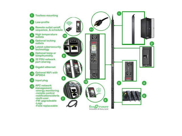 With high reliability, manageability, and security, APC Switched Rack PDUs provide advanced load management plus on/off outlet level power cycling and sequencing control.