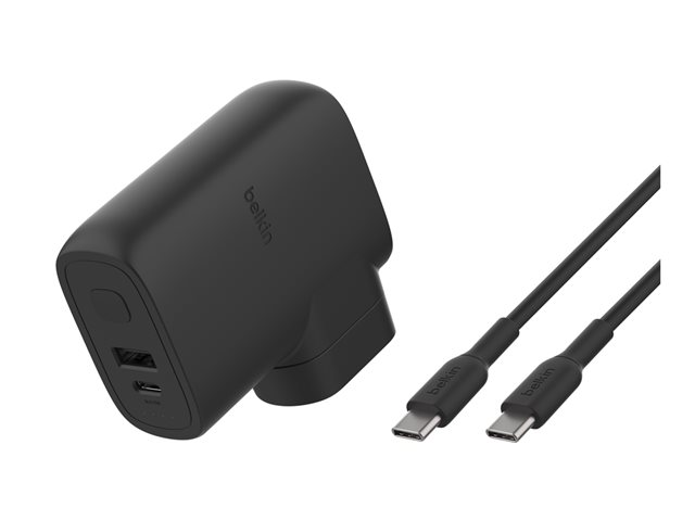 - Dual ports (1x USB-C and 1x USB-A) support two devices charging simultaneously