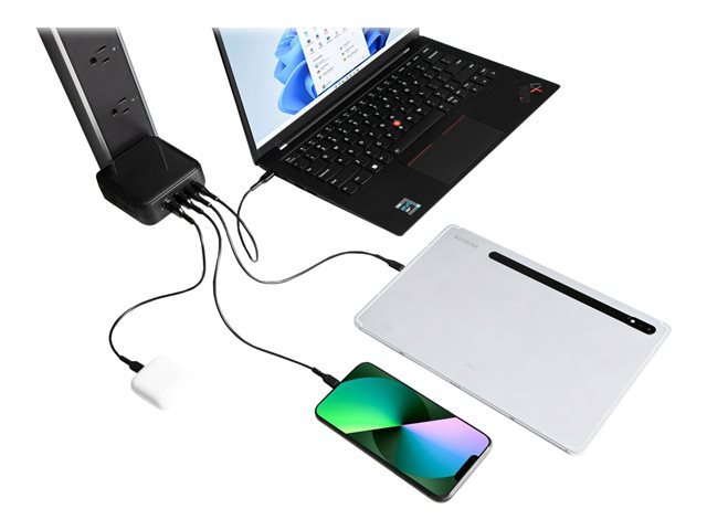 Count on high power delivery that lasts longer than traditional chargers with the Targus 100 W GaN Wall Charger. Powered by effective GaN technology, this charger packs a powerful punch with 4 ports - 2 USB-C (with a single port use up to 100 W) and 2 USB-A with quick-charge capabilities supporting up to 18 W - so you could essentially charge your work laptop, personal laptop, phone, and tablet at the same time. GaN charging is more efficient in power transfer, so it uses less energy and disperses less heat as it works. This means cooler and safer charging for you. Like all Targus products, this charger passes strict quality and safety standards and meets UL requirements.
