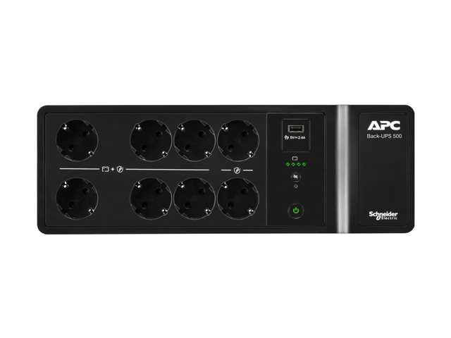 The APC Back-UPS BE500G2-GR is designed to provide reliable backup power and surge protection for your home and office devices. With a power capacity of 500 VA and an efficiency of 80% at full load, it ensures that your devices are protected and continue to operate during power outages. The UPS features an integrated power cable and can be wall-mounted or surface-mounted, offering flexibility in installation. It includes 8 output connectors, with 2 dedicated to surge protection, allowing you to connect a variety of devices. The unit also boasts LED indicators and an audible alarm for easy status monitoring and alerts. Compliant with key environmental and safety standards such as RoHS and REACH, and offering an Equipment Protection Value of €1,000,000, the APC Back-UPS BE500G2-GR provides both performance and peace of mind.