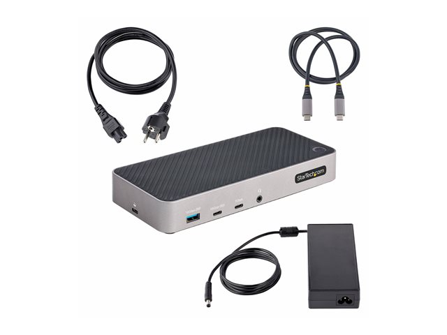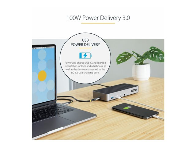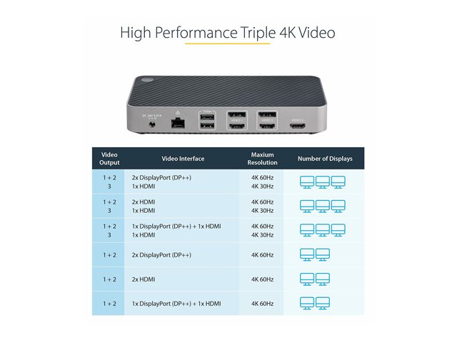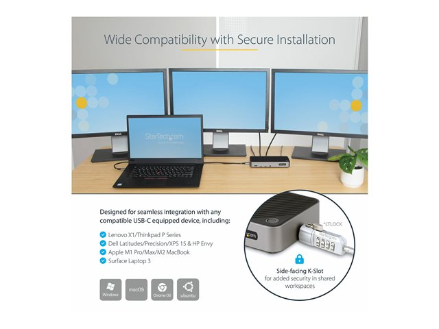 This USB-C triple 4K monitor docking station enables wide workstation flexibility, featuring compatibility with USB-C, or Thunderbolt 3/Thunderbolt 4 laptops, and supporting multiple combinations of Ultra HD 4K DisplayPort and HDMI monitors.
