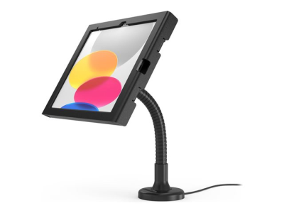 Our Flex Arm stand can be mounted on any flat surface, counter-top or to a wall for use as a secure interactive display or kiosk with a bendable arm that is great for corners and where counter space is limited. Limited cable management is available through the mount and arm of the stand and there is an adhesive no-screw base add-on available.