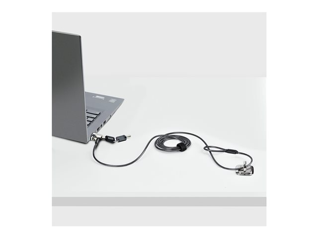 Laptop Cable Lock is compatible with Noble Wedge slot, and it's designed to deter the theft of laptops and other ultra-slim notebooks. The laptop lock features a 6.5 ft (2 m) cut-resistant cable with a PVC coating, making it a durable and reliable solution for securing laptops. The lock body features zinc-alloy plating, which prevents corrosion and wear. The compact design of this lock is perfect for ultra-slim notebooks, 2-in-1 laptops, tablets, and many other devices that feature a Noble Wedge slot.